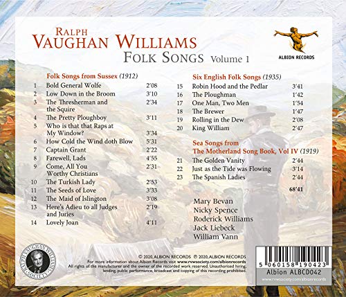 This is the first in a series of four albums recording all 80 of the folk songs in English that Ralph Vaughan Williams arranged for voice and piano or violin. 57 of the 80 songs have not previously been recorded in these arrangements, so there is a good deal of unknown – but very beautiful – music to be found here. This first album has 23 tracks including 15 world premières. It includes Folk Songs from Sussex (1912) and Six English Folk Songs (1935). Later volumes will include songs collected in the Eastern Counties (1908), the Appalachian Mountains (about 1938) and from Newfoundland (1946). Vaughan Williams is well known as a collector of folk songs, but his own collection by no means predominates in this series; most of the arrangements were made and published as a collaborative effort, drawn from many sources. The 14 songs from Sussex on this album were all collected by Percy Merrick from Henry Hills, a farmer from Lodsworth, Sussex, around 1900. Some will be well-known in other arrangements; others will be unfamiliar.
